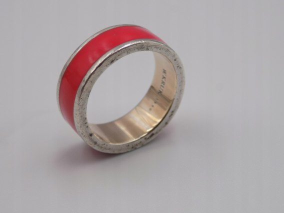 nazwa: piękny, stary, ciekawy, srebrny pierścionek / obrączka W. Kruk - czerwona emalia - pozłacana - wykonana ze srebra 925, w rozmiarze 17 / 18 - biżuteria VINTAGE