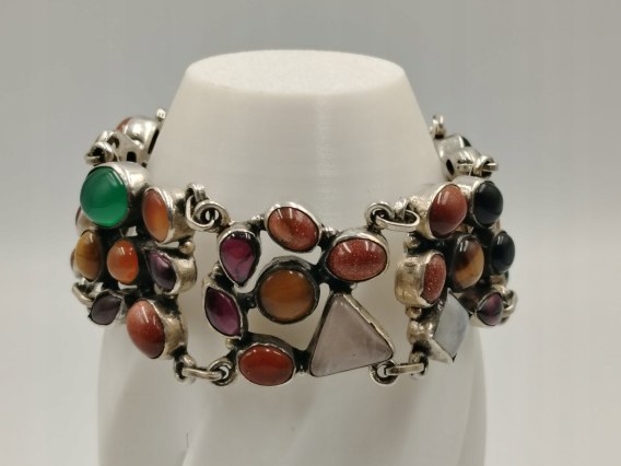 Dzisiaj w ofercie: stara, piękna, ciekawa, autorska, damska, srebrna, bransoletka na rękę z dodatkiem różnych kamieni - wykonana ze srebra - biżuteria - VINTAGE