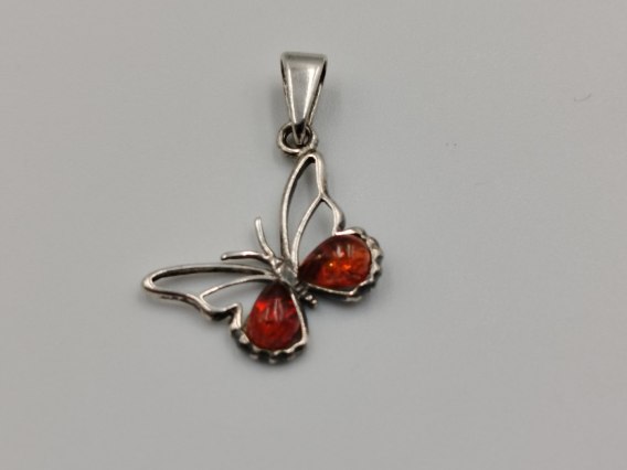 model / wzór: srebrny damski wisiorek / zawieszka ażurowa " MOTYL / MOTYLEK " z dodatkiem bursztynu