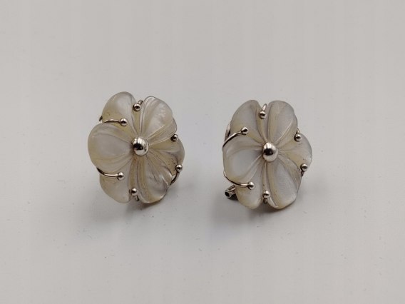 • nazwa: piękne, stare, autorskie, ciekawe, srebrne, damskie kolczyki / klipsy ILARIA wykonane z masy perłowej i srebra w formie kwiatu - biżuteria VINTAGE