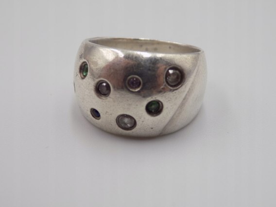Dzisiaj w ofercie: piękny, stary, ciekawy, srebrny, szeroki pierścionek / obrączka wraz z kolorowymi cyrkoniami - wykonana ze srebra 925, w rozmiarze 15 - biżuteria VINTAGE