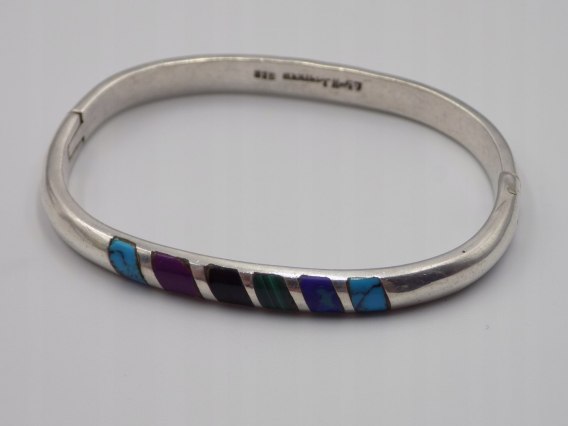 Dzisiaj w ofercie: autorska, piękna, stara, ciekawa, niespotykana, damska, srebrna bransoletka na rękę KOŁO BANGLA otwierana MEXICO 925 - TURKUS, MALACHIT, ONYKS - srebro 925 - biżuteria - VINTAGE